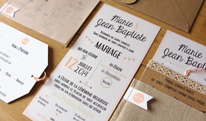 Réalisation sur mesure et unique du faire-part de mariage de Marie & Jean-Baptiste avec un carton principal, un carton dîner/programme et un carton réponse type carte postale. La future mariée souhaitais une création avec beaucoup de petit...